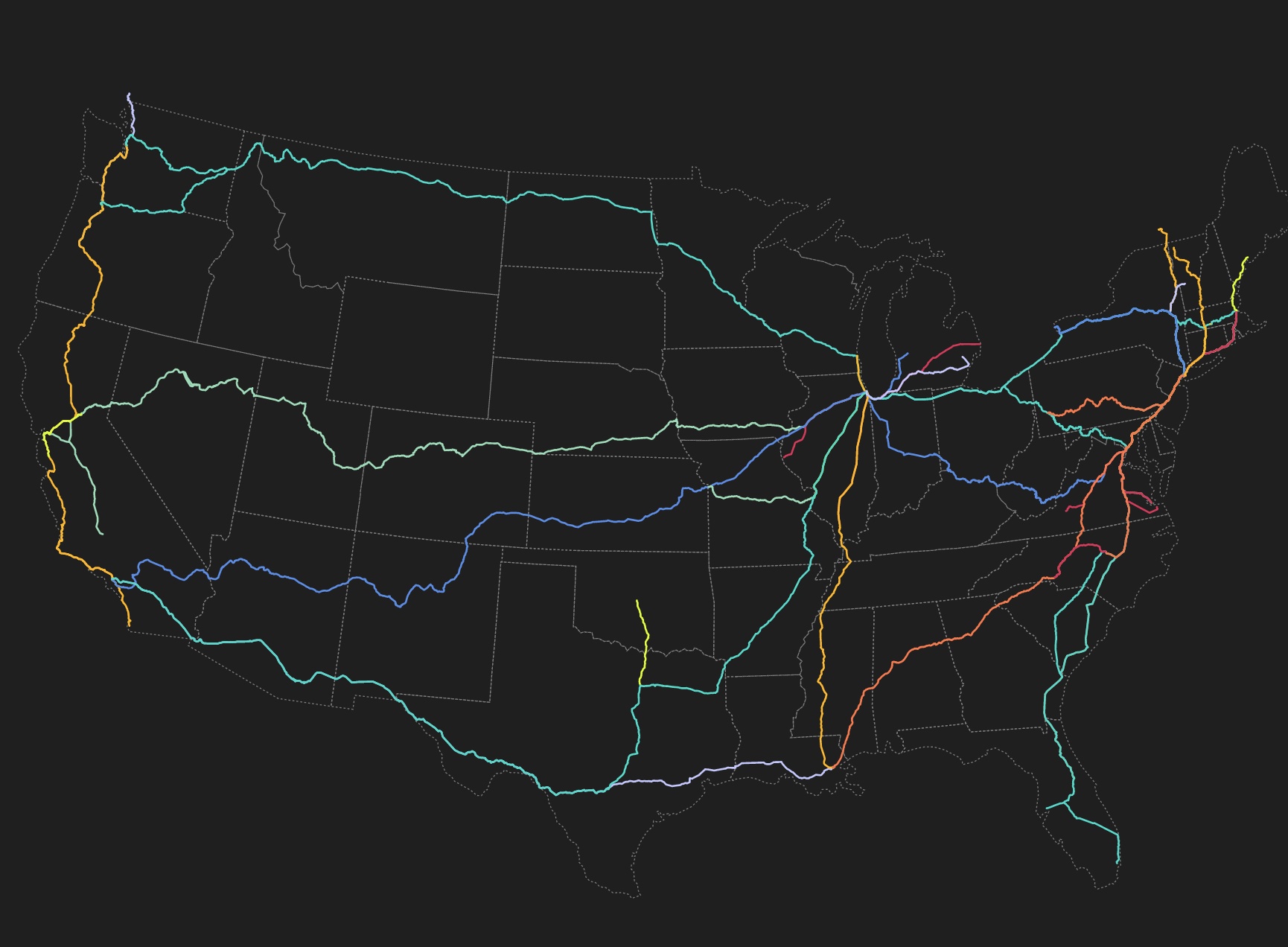 A train map by Rachel Binx which absolutely puts the Amtrak website to shame. Rachel’s is far more usable and beautiful. Rachel also included some useful links for people interestd in making similar visualizations, like this GeoJSON file of all the routes.