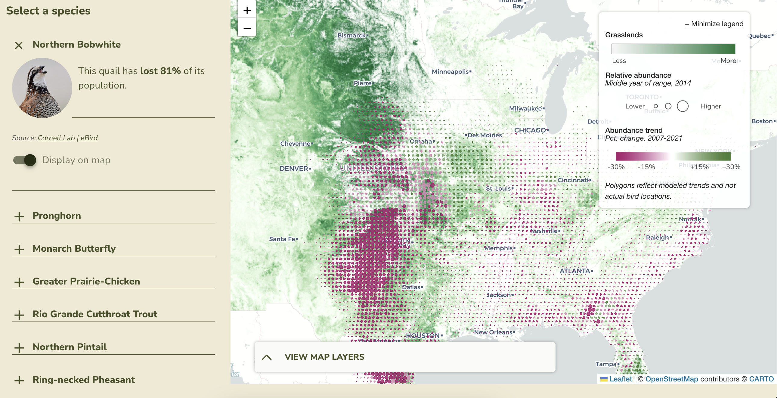 In collaboration with the Cornell Lab of Ornithology, we created a web tool that shows how this loss is affecting wildlife species. This tool is mean to raise support for the North American Grasslands Act, a national plan to protect and restore our grassland habitat.