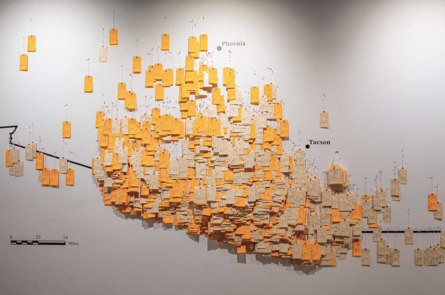 The Undocumented Migration Project is a perfect example of what Aviles calls “socializing the research”. Yellow color-coded toe tags represent migrants who died crossing the Arizona border. Each one has handwritten information, which was an intentional choice—volunteers had to spend time writing each name physically.